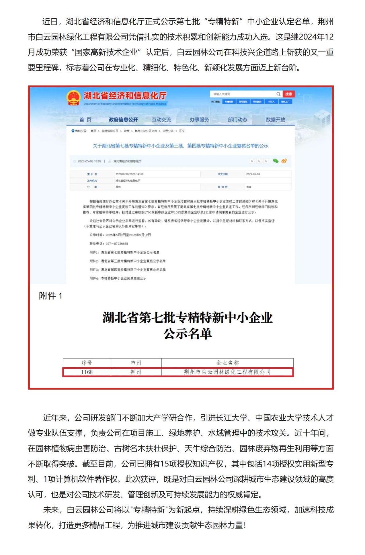 喜报丨白云园林公司成功获湖北省“专精特新”中小企业认定